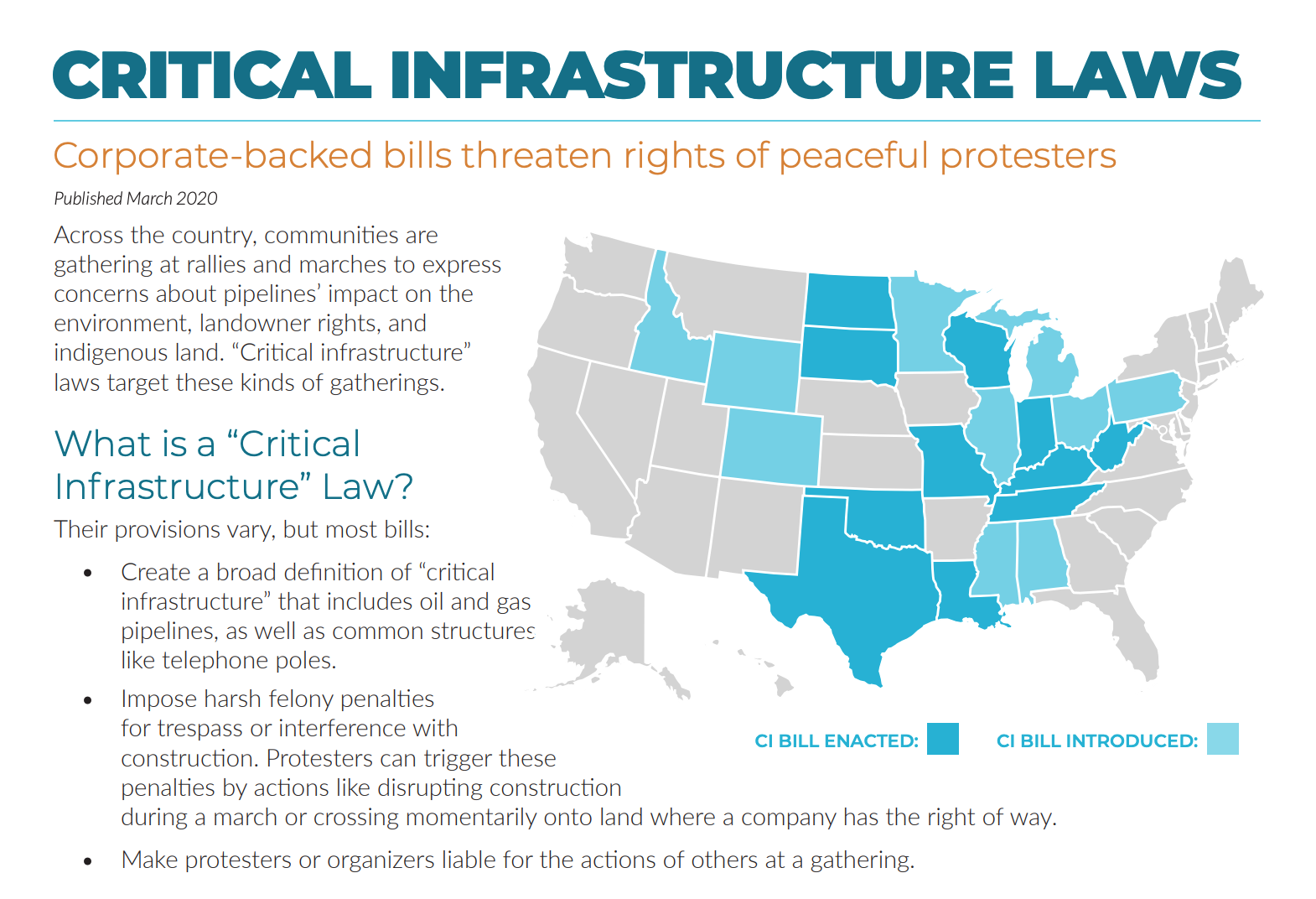Known as “critical infrastructure bills,” these laws impose harsh criminal penalties and steep fines on activists who attempt to physically block the construction of oil and gas pipelines or other so-called “critical” fossil fuel infrastructure. Such acts have become increasingly popular—and effective—since the Standing Rock Sioux protests against the Dakota Access pipeline captured the world’s attention in 2016.