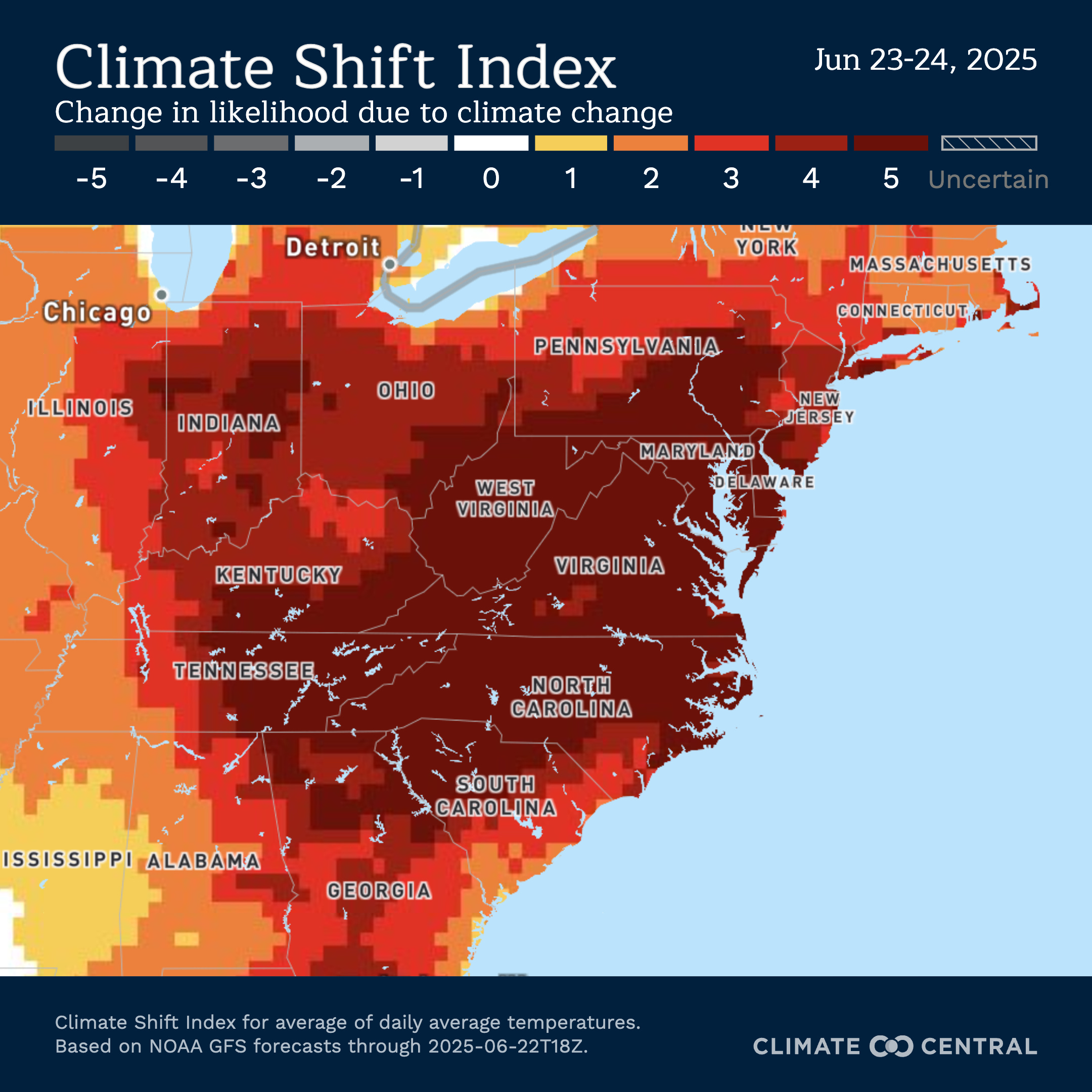 Across nearly the entireties of Maryland, Virginia, West Virginia, North Carolina, and Washington, D.C., climate change made this week’s extreme heat five times more likely.