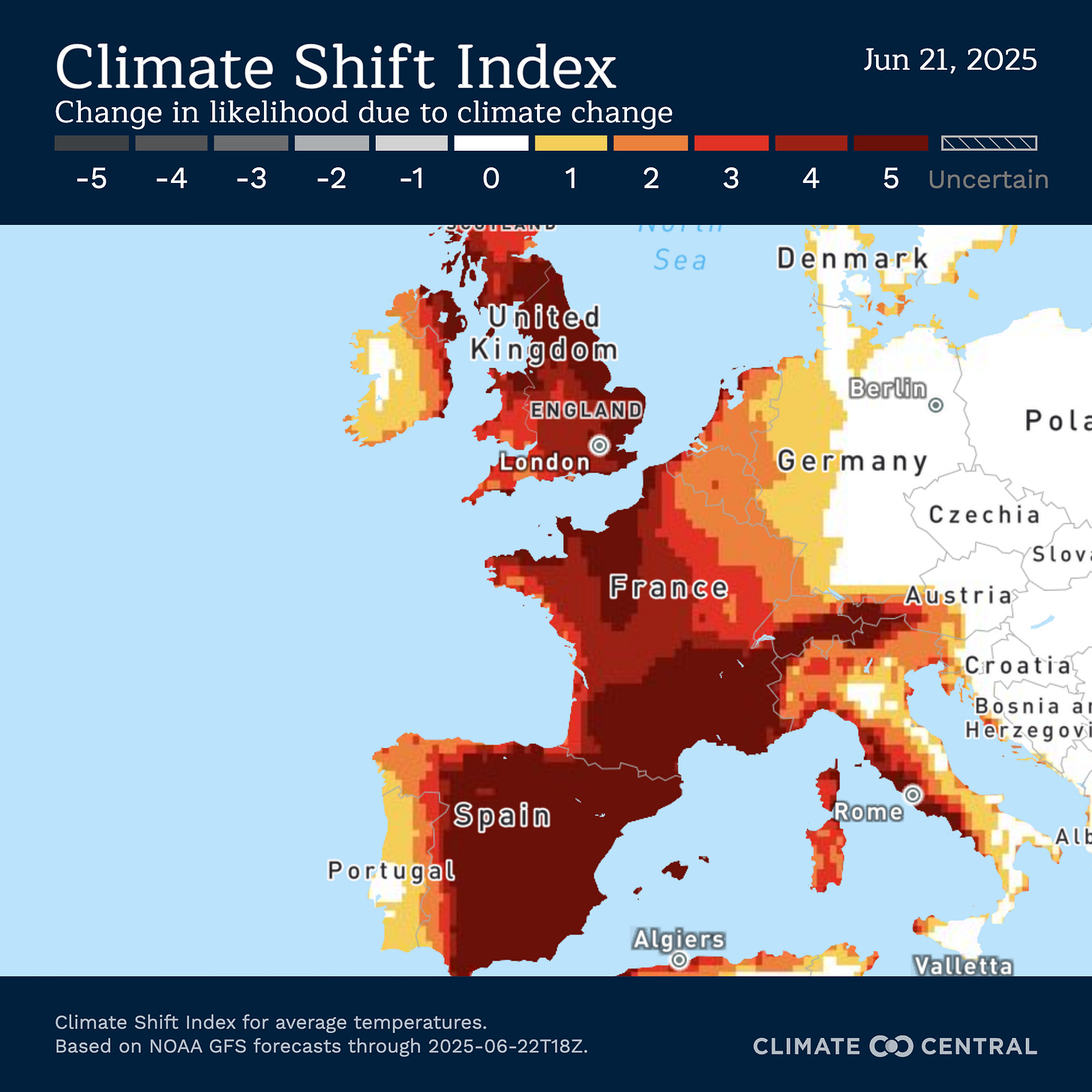 Western Europe in particular is experiencing temperatures up to 28.6°F hotter than normal. That heat was also made up to five times more likely by climate change.