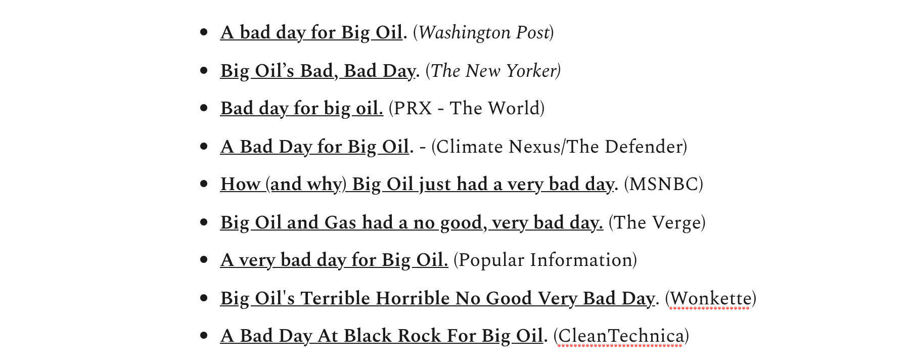 A couple weeks ago, I lightly complained about news articles that frame climate wins as oil losses. To explain my annoyance, I cited three headlines about the May 26 climate activist victories against Exxon, Chevron, and Shell. They all called it a “Bad Day” for Big Oil.