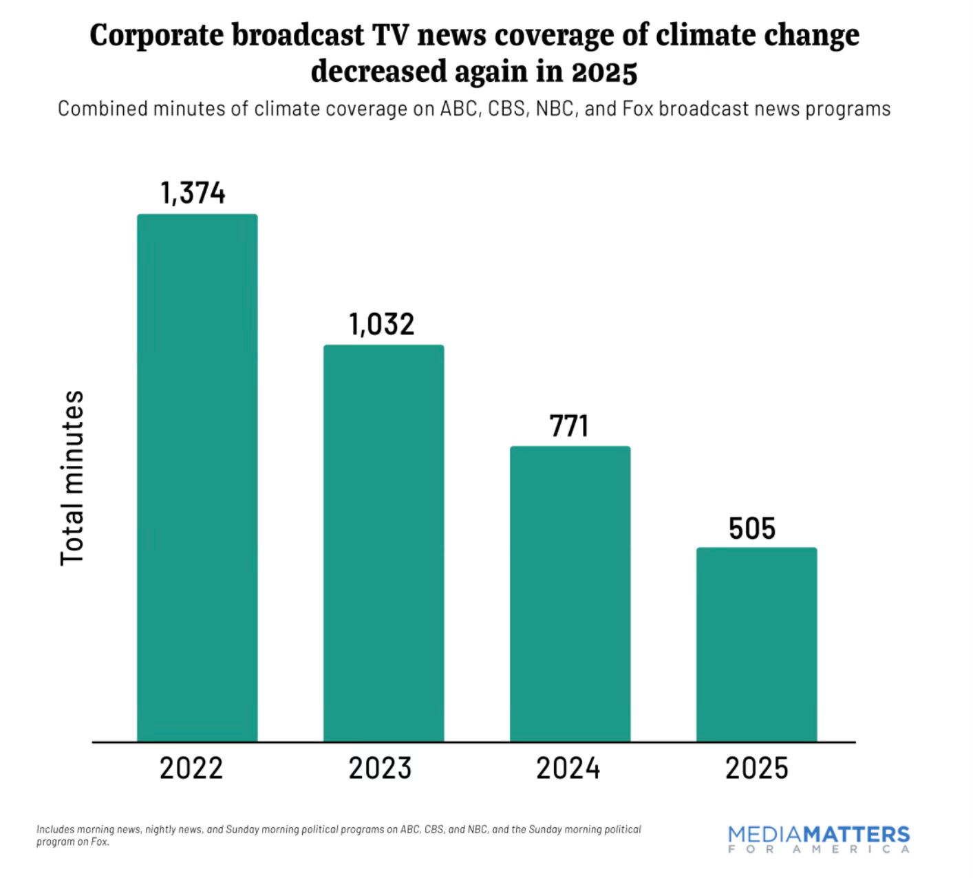 According to that report released Wednesday, corporate broadcast climate coverage dropped 35 percent from 2024 to 2025—from 771 minutes to 505 minutes across NBC, CBS, and ABC combined.