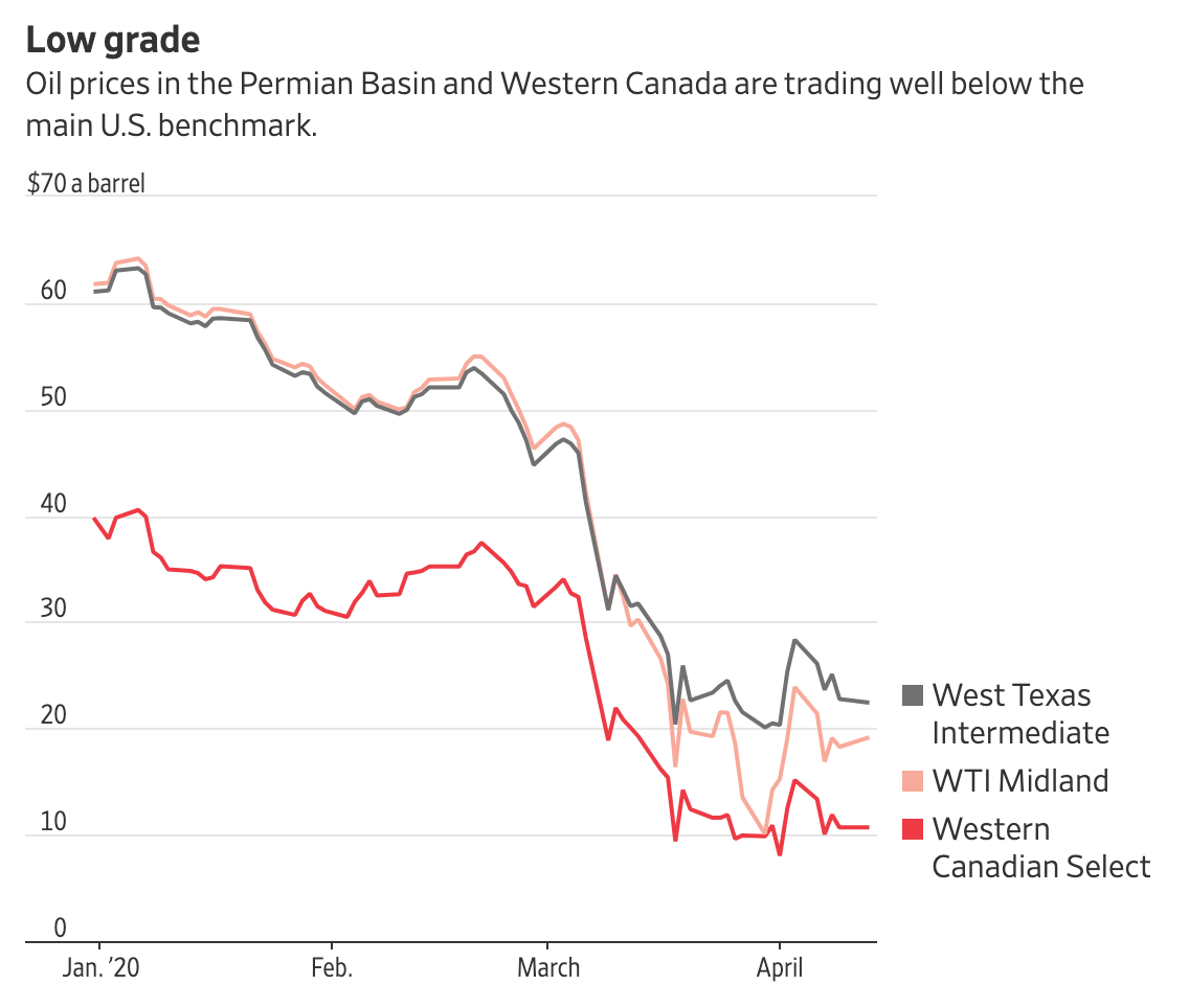 Because of coronavirus, “The global oil industry is experiencing a shock like no other in its history,” International Energy Agency executive director Fatih Birol told the Wall Street Journal on Tuesday. People aren’t going anywhere, or doing anything—so there isn’t a huge demand for oil. Prices are therefore dropping to historically low levels. Twenty dollars a barrels! Look at these charts from the Wall Street Journal and Business Insider. Look at them!