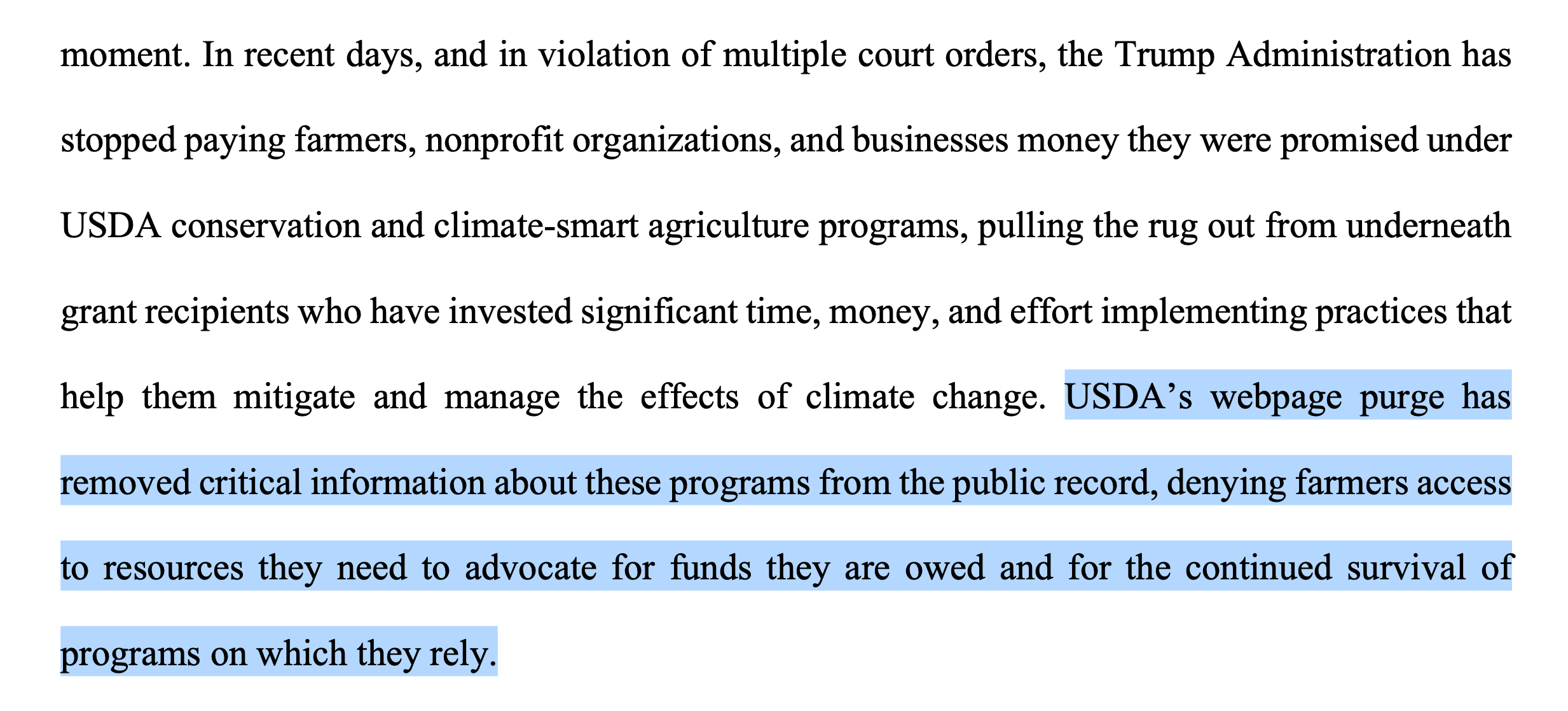 The order resulted in a widespread, unprecedented information purge from USDA’s websites—not just of general climate change information, but of interactive data tools and funding resources related to soil conservation, sustainable agricultural practices, and extreme weather resilience, the lawsuit claimed.