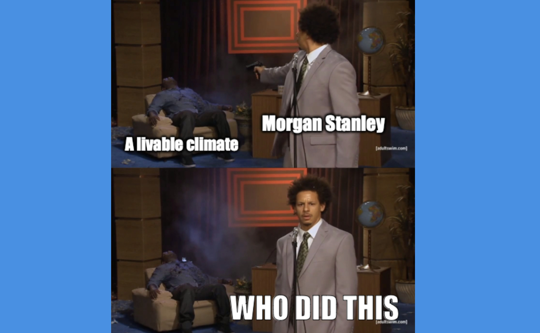 But overall, it seems Byrd wants us to believe that Morgan Stanley has no moral attachment to this finding; that they are simply reporting what they see and telling their clients, as is their obligation. What he likely doesn’t understand is that the bank’s air of detachment is precisely what that makes this report so nauseating. Because Morgan Stanley is in no way detached from the future outcome of climate change. Indeed, if the world does reach 3°C, it will be in part because of them.