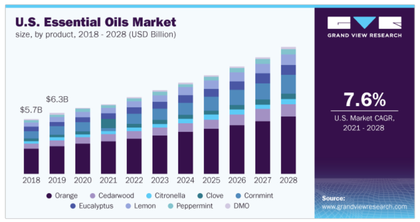 But just like granola, essential oils have been industrialized. In fact, they are “one of industry’s most successful commodities,” according to a 2022 review in the journal Plants. In 2020, the global essential oils market was valued at $18.6 billion, about the same as the global market for plastic bags. The essential oils market is also rapidly growing “due to the strong demand for pure natural ingredients in various fields,” according to a 2021 review in the journal Molecules. (This is certainly reflected on Amazon; its number one most-gifted beauty item is an essential oil shower bomb kit).