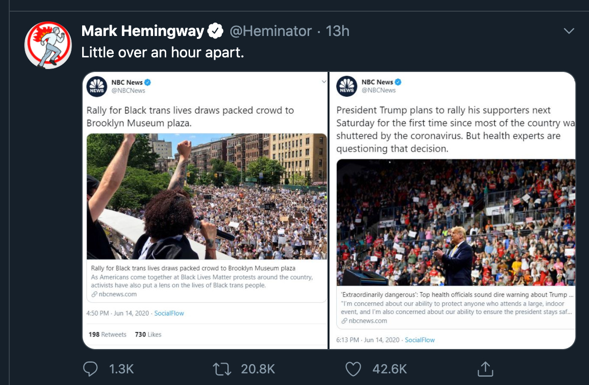 A viral tweet comparing NBC’s coverage of two stories: a civil rights protest in Brooklyn this weekend, and President Trump’s planned rally in Tulsa, Oklahoma on Saturday. It implies NBC was being biased by calling Trump’s event “dangerous,” and not the protests.