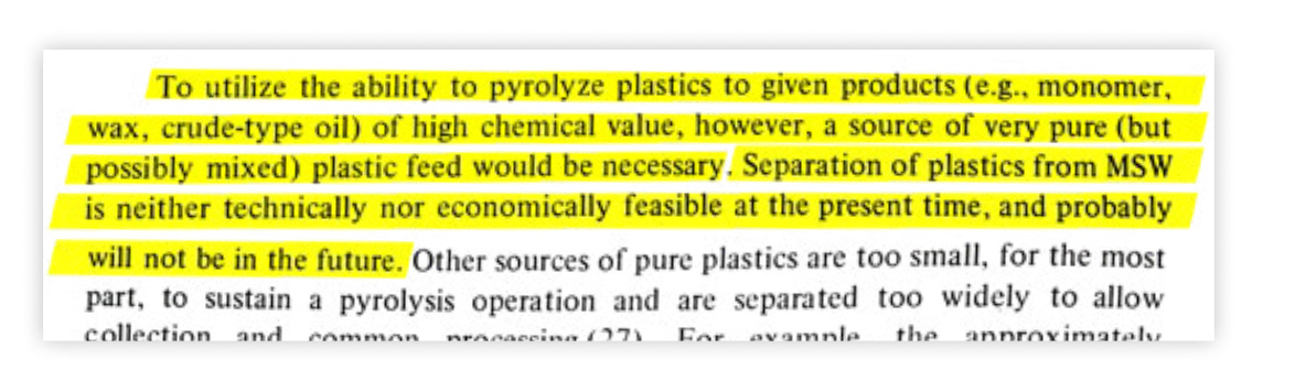 As early as 1973, an industry consultant wrote that “separation of plastics from [municipal solid waste] is neither technically nor economically feasible at the present time, and probably will not be in the future,” according to documents obtained by the Center for Climate Integrity. In 1987, an article published in Conservation & Recycling found that “destructive technologies, such as incineration and pyrolysis, are quite wasteful.”