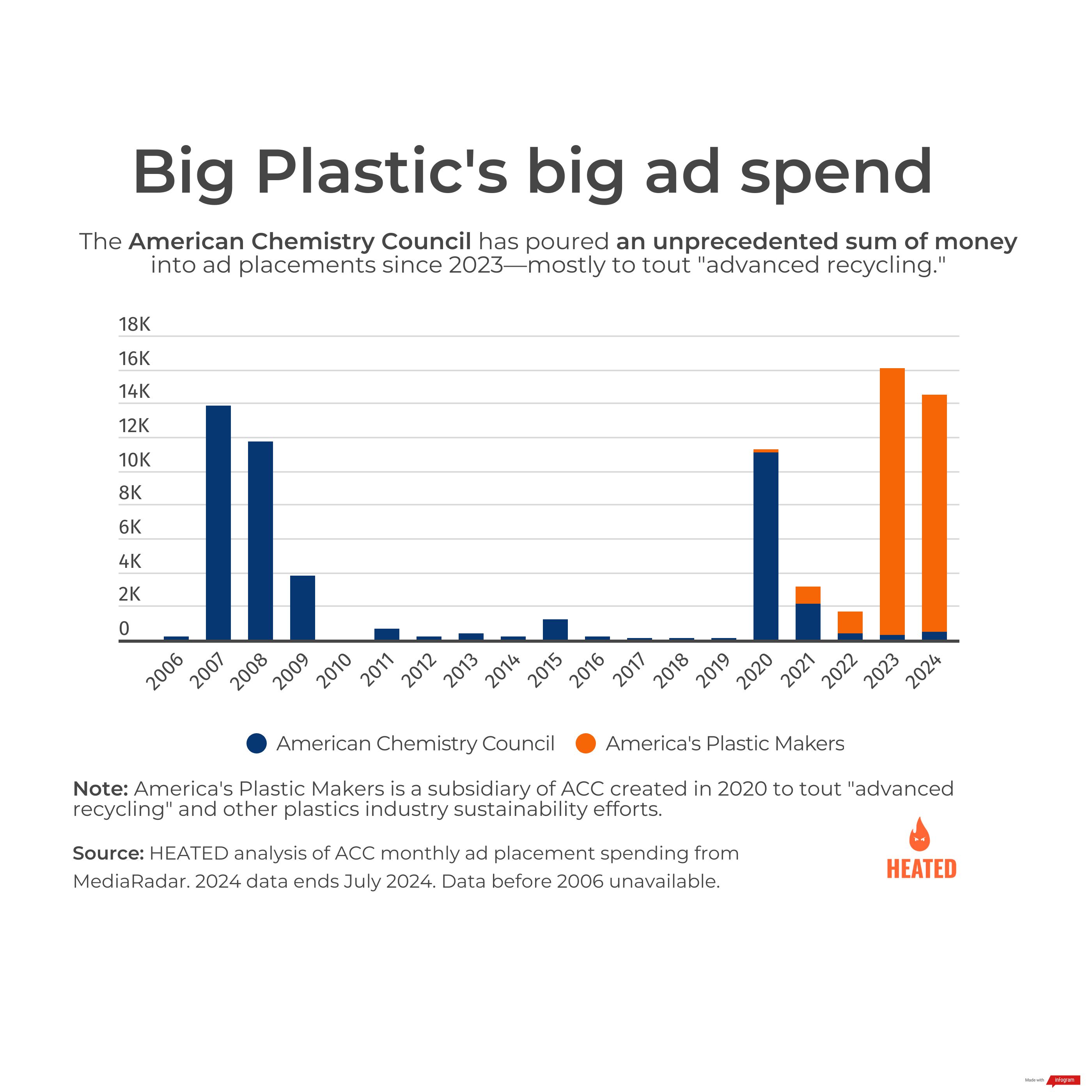 The ad is from the American Chemistry Council (ACC), the plastic industry’s most powerful lobbying group, under its subsidiary America’s Plastic Makers. It’s part of one of the most expensive ad pushes in ACC’s 152-year history: So far, America’s Plastic Makers has spent nearly $30 million since 2023 to place ads touting “advanced recycling” and other sustainability measures, according to a HEATED analysis of data from ad insights firm Media Radar. That dwarfed the ACC’s lobbying spend over the same period by millions.