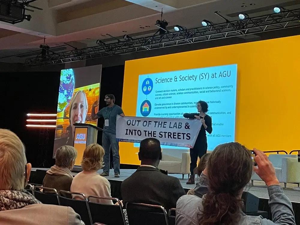 On a quiet Thursday afternoon in mid-December, two prestigious climate scientists stepped on stage at the world’s largest Earth science conference, holding a banner that read, “Out of the lab, into the streets.”